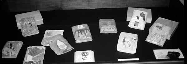 Anne Hicks Siberell: The Day Before Yesterday's Ancient Tablets ; 12 tablets from Volume I, made between 1980-90; Ceramic & found objects in wooden boxes.